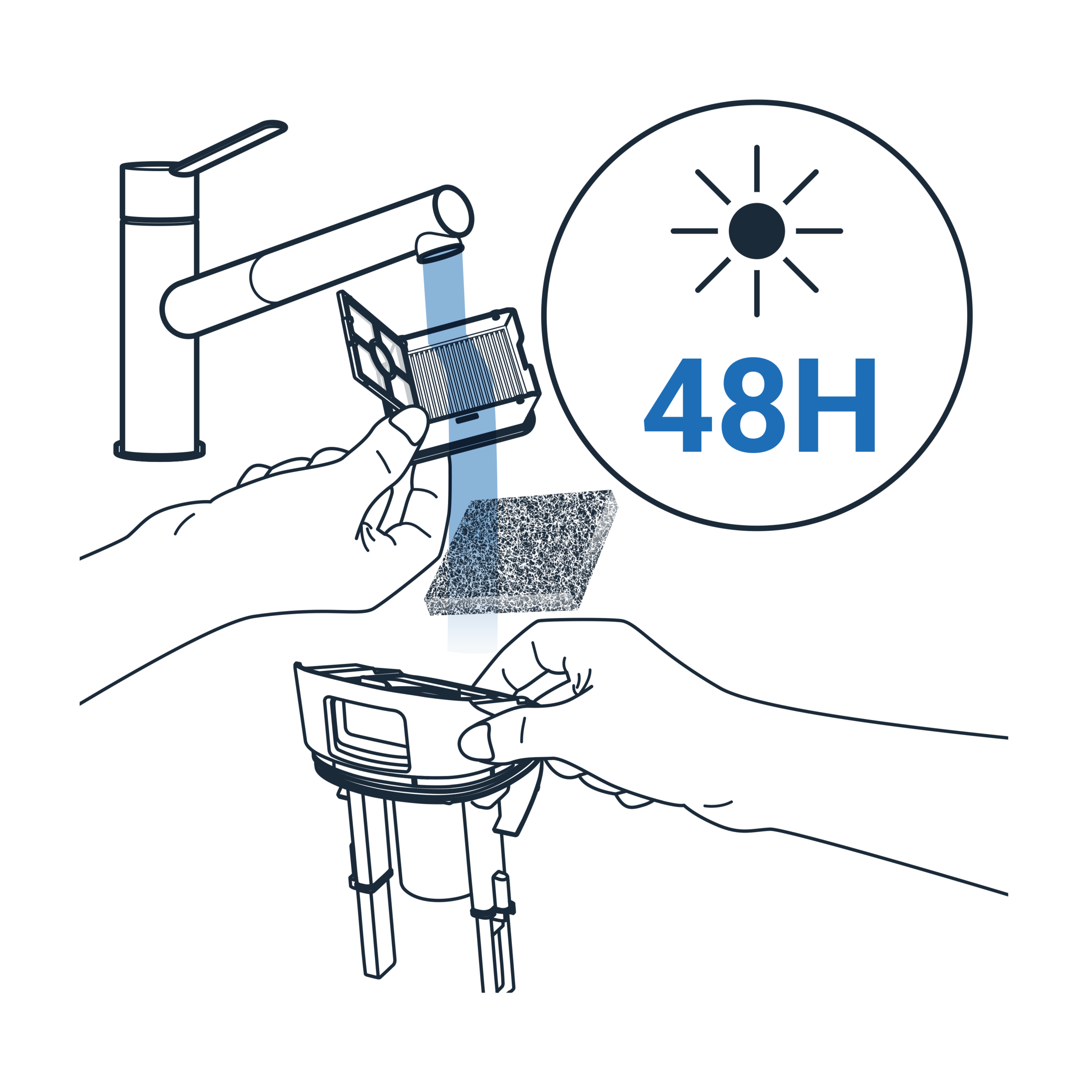 Einmal pro Woche den Faltenfilter und Schaumstofffilter ausspülen und anschließend vollständig trocknen lassen (48 Stunden trocknen).