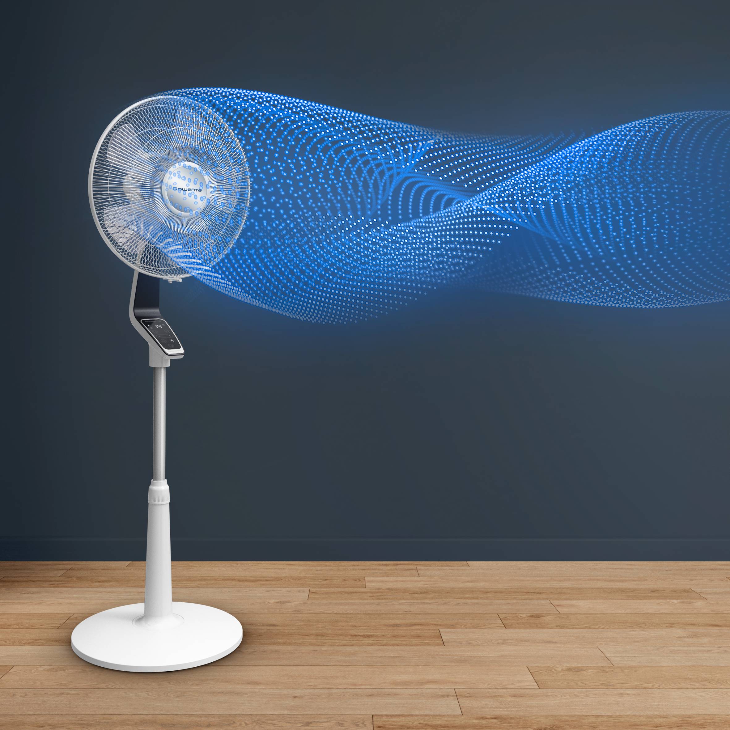 Dank unseres brandneuen Effitech-Motors können Sie den ganzen Sommer über eine intensive Abkühlung bei vollständiger Lautlosigkeit genießen, was für ruhige, erholsame Nächte sorgt. Seine neue Technologie bietet die gleiche hohe Leistung, die Sie von Rowenta erwarten, und verbraucht dabei 55% weniger Energie.* (*Luftdurchsatzleistungen intern gemessen gemäß der Norm EN/IEC 60879:2019 und definiert bei 50 m³/min, im Vergleich zum Modell VU5640F2).